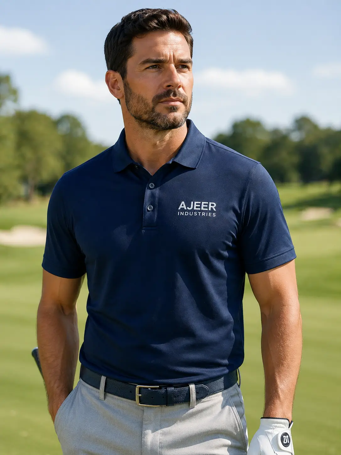High-performance men’s golf polo shirts manufactured for golf clubs, corporate events, tournaments, and private label brands. Moisture-wicking performance fabrics, structured collars, and full branding customization including embroidered logos and custom color combinations.